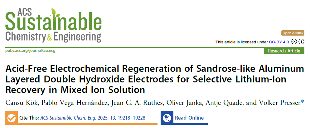 New paper published in ACS Sustainable Chemistry & Engineering. We present a mildly synthesized aluminum layered double hydroxide (Al-LDH) electrode that couples chemical adsorption with electrochemical release to recover lithium at neutral pH, eliminating harsh acids or bases and minimizing secondary pollution. It achieves an average Li+ uptake of 57.6 mg/g with strong Li+ over Na+ selectivity (vs. 1.0 mg/g for commercial Al(OH)₃ over 15 cycles), positioning Al-LDH as a scalable, green candidate for next-generation direct lithium extraction.